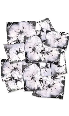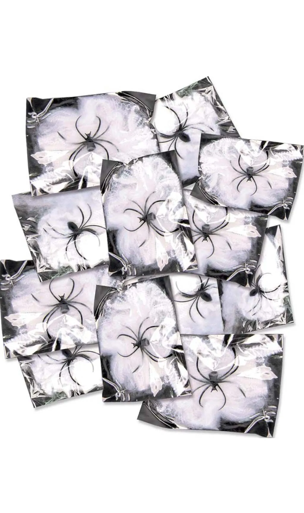 Kleine Spinnen! 12 Beutel mit jeweils einer Spinnen in ihrem Netz. Hängen Sie sie dort an die Decke, wo Sie ein düsteres Ambiente an Halloween, im Karneval und auf Horrorpartys schaffen wollen.