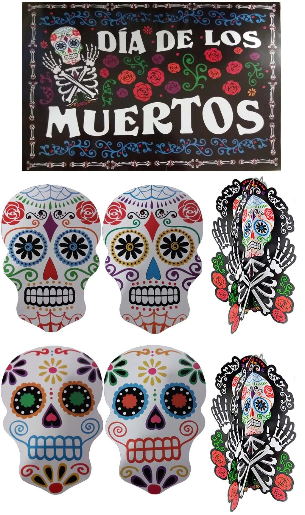 Bunte Totenköpfe! Mit diesem Totenkopf Deko Pack 7 Stück wirst du deine Möbel, Regale sehr originell auf Terror, Halloween und Karneval Feste schmücken können.