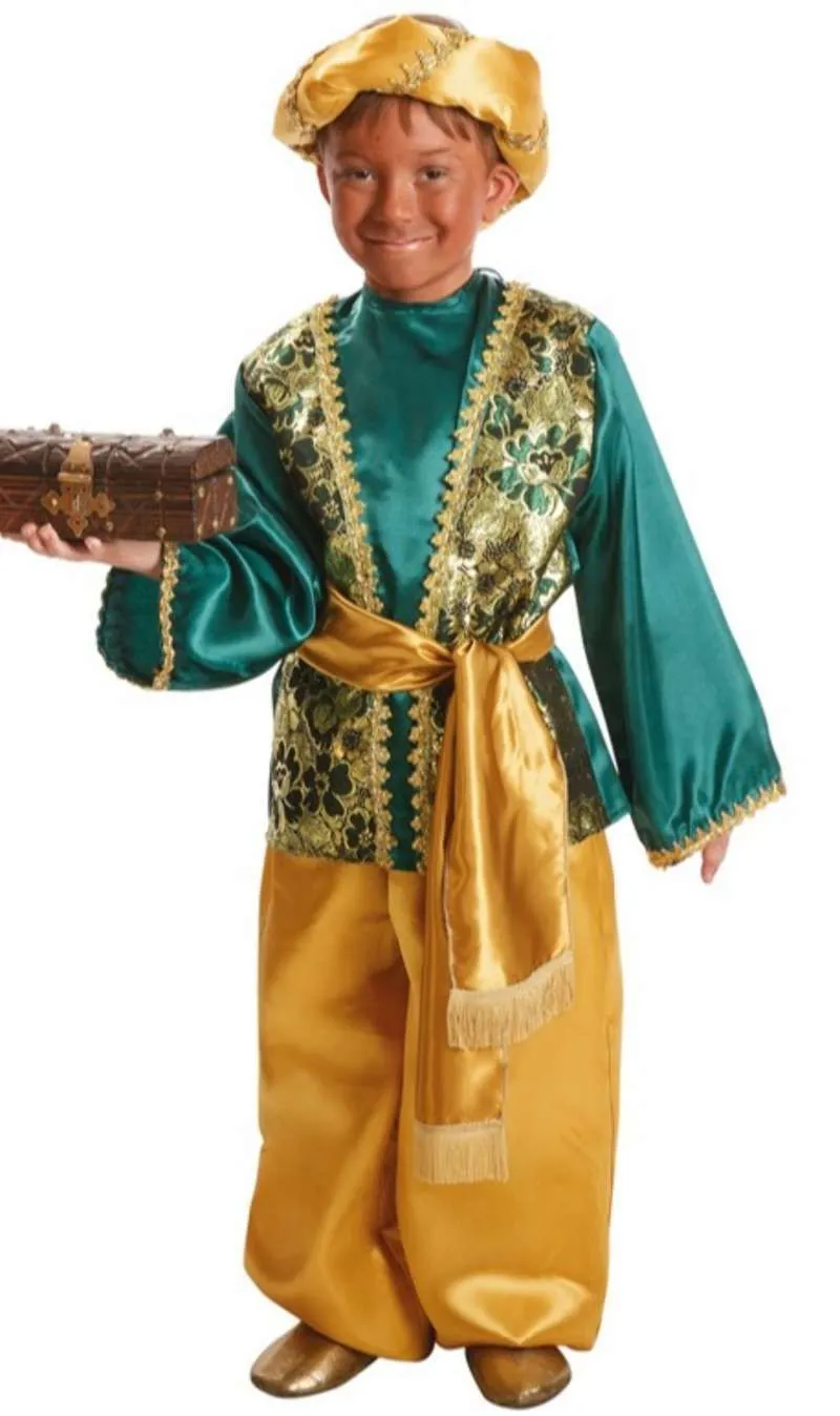 Die Pagen der Heiligen drei Könige werden mit diesem Kostüm deine Aufmerksamkeit erregen, die glänzenden Stoffe und Gold Verzierungen verwandeln sie in authentische Weihnachtsfiguren auf Kinderfestivals.