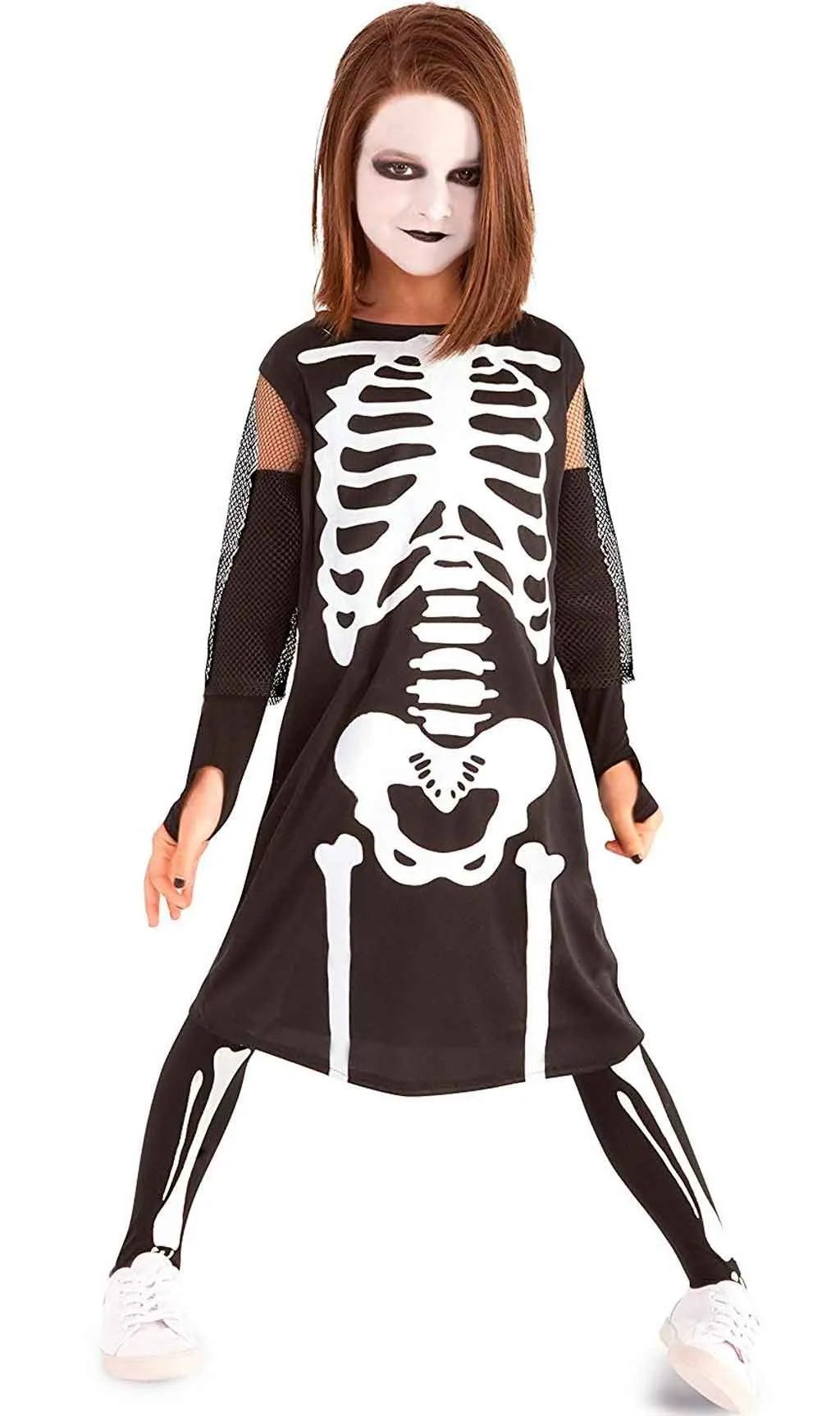 Knochengerüst! Bewege deine Knöchlein mit diesem Skelett Kleid Kostüm für Mädchen auf der Terror-Nacht. Verwandle Dich in die koketteste und witzigste auf thematische Feste, Halloween und Karneval.