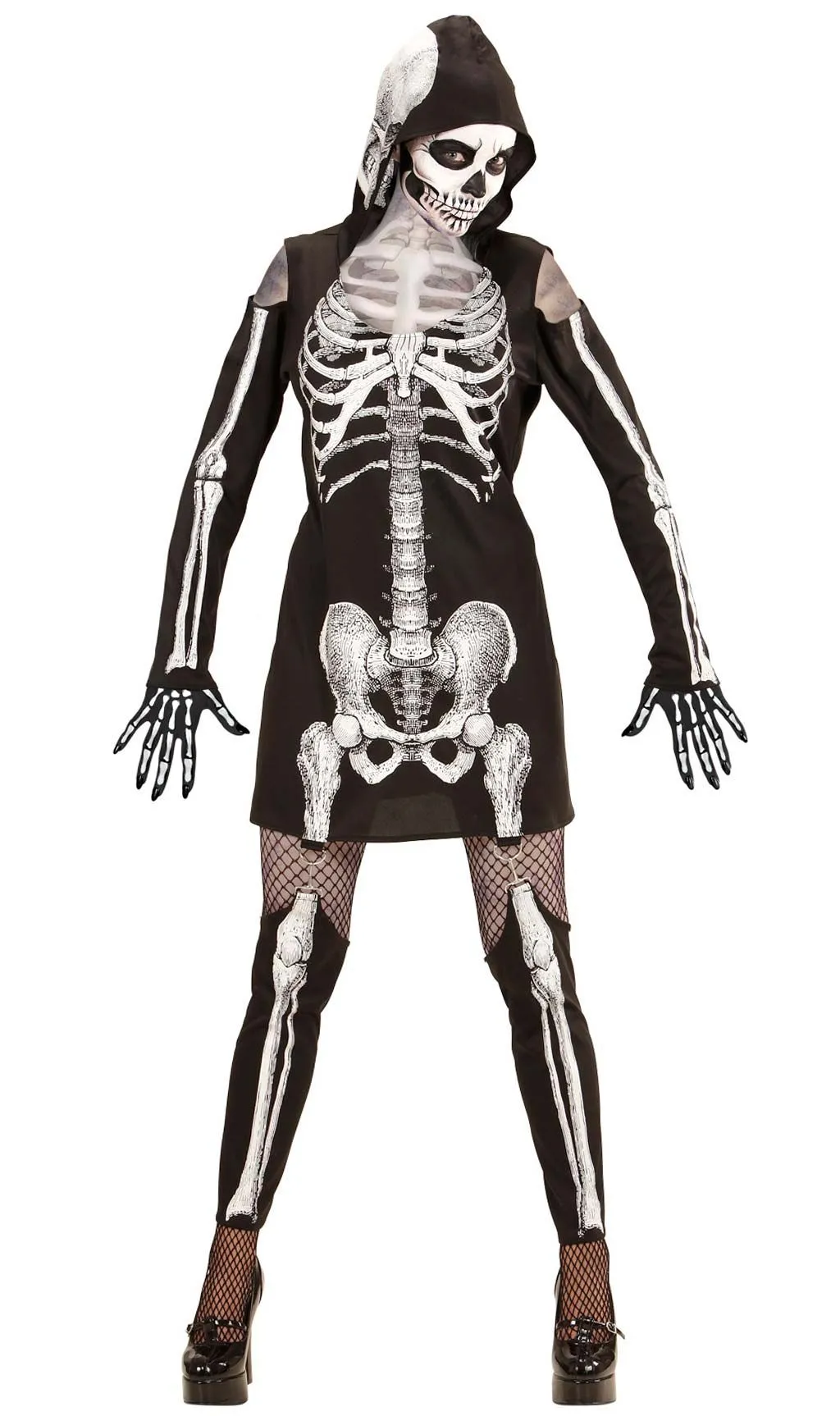 Dieses Skelett Totenkopf Kostüm für Damen ist ein gruseliges aber auch freches Kleid, das für einen sexy Look an Halloween sorgt. Die Kapuze mit Schädel Aufdruck ist ein sehr originelles Outfit für Halloween, Fasching, Karneval und natürlich auch für die nächste Mottoparty.