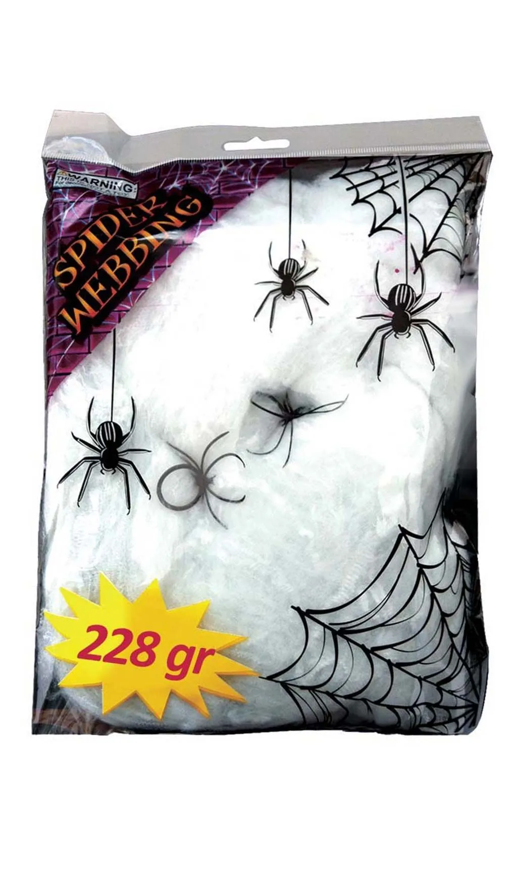 Weiß mit Jägerinnen! Weißes Spinnennetz mit 2 schwarzen Spinnen, perfekt für eine spektuläre Dekoration von Kostüm- und Halloweenpartys.